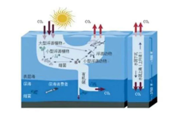 海洋對于減緩氣候變化具有舉足輕重的作用。海洋碳庫約是陸地碳庫的20倍,且海洋碳儲藏時間尺度比陸地生態系統長的多。全球大洋吸收了工業革命以來人類排放CO2總量的1/3,目前每年從大氣吸收COz達20億噸,約占全球CO2排放量的1/4。海洋吸收CO2的主要機制包括“溶解度泵”、“碳酸鹽泵”、“生物泵”及“微型生物碳泵”。
